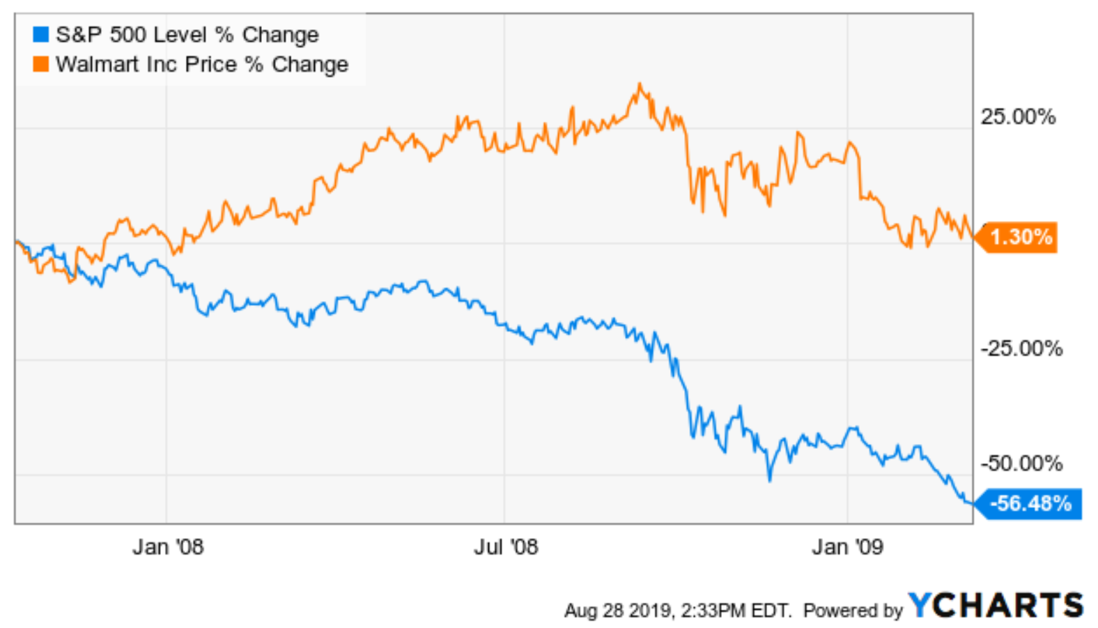 Recessions hurt the U.S. consumer — they don’t outright kill U.S. consumption. As such, consumers still shop during recessions because they still need things like food, clothes and other essentials. The only difference in a recession is that they are doing this “essentials” shopping at discount retailers. Walmart is the king of the discount retail segment. Thus, when times get tough, consumers flock to Walmart to save money on their “essentials” shopping.
