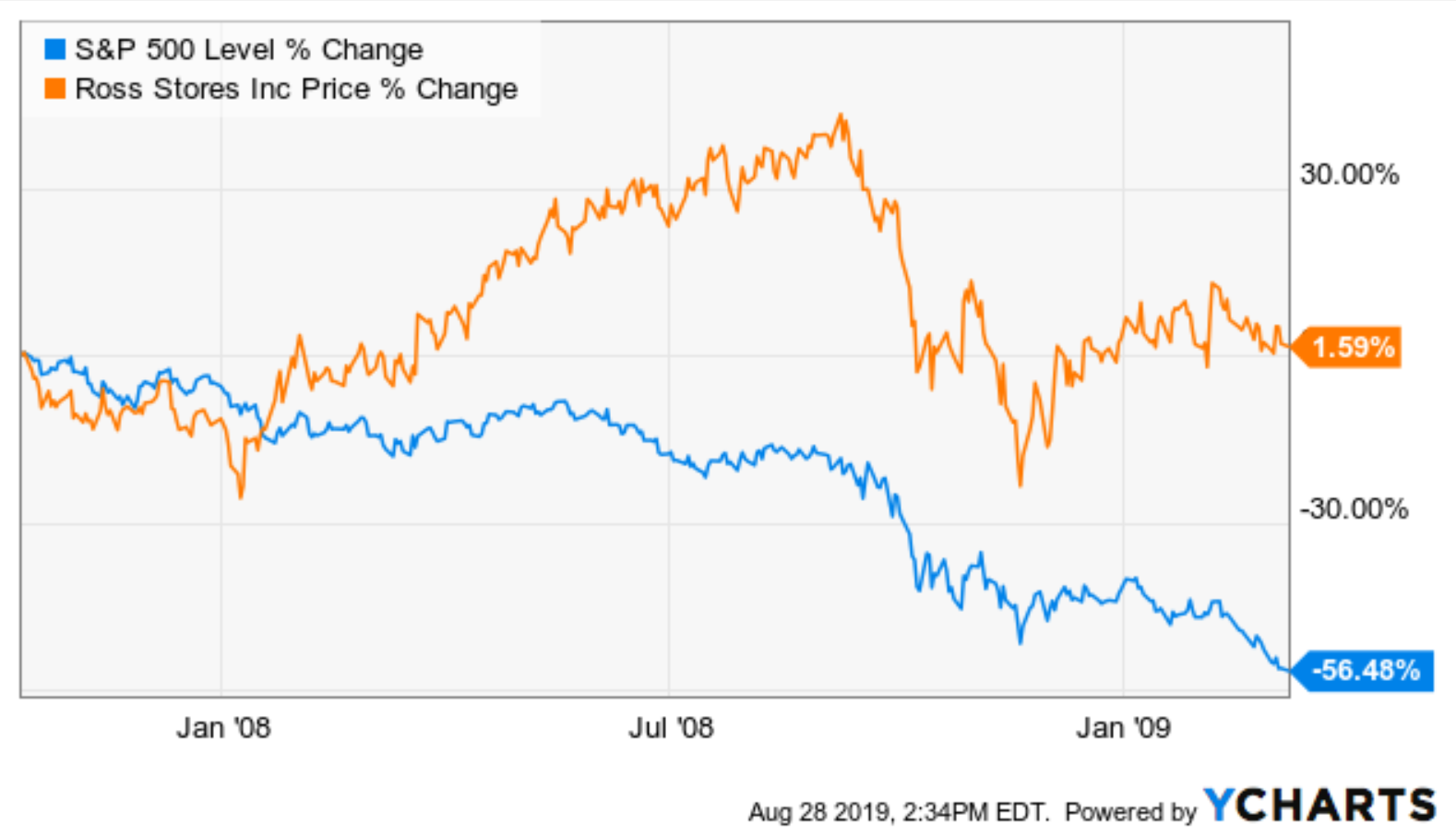 That is, during tough economic times, money becomes tight. But, consumers still need to live, so they still need to buy things like food, clothes, so on and so forth. In a recession, they just migrate all that shopping from full-price stores to off-price stores. Ross Stores owns two of those off-price stores — Ross Dress for Less and dd’s Discounts.
