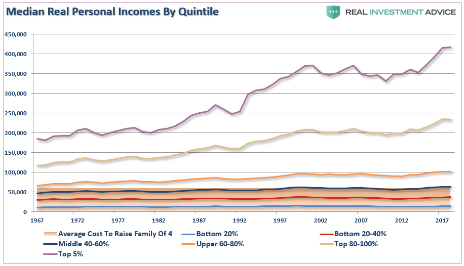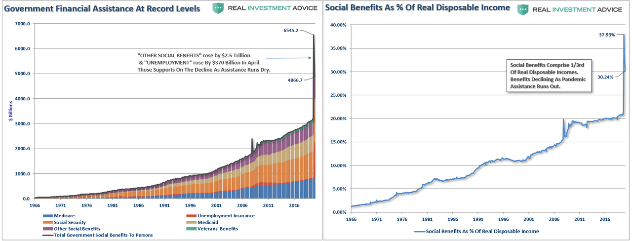 For the rest, two major bear markets, lack of wage growth, and surging costs of living have eroded any ability to build savings for retirement. Such is why most retirees will depend on social welfare for 50%, or more, of their retirement income.