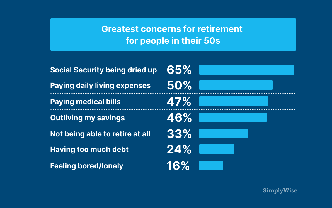 “For those not yet claiming Social Security benefits, financial concerns are among the highest anxieties around retirement. Fifty-seven percent worry about Social Security drying up, and 52% worry they will outlive their savings. For Americans who are currently on Social Security, 54% now worry about their benefits drying up – a significant increase from the 29% reported in July. Also, 47% are concerned about their ability to pay for medical bills in retirement. Another 47% are concerned about their ability to pay daily living expenses when they retire.” – SimplyWise