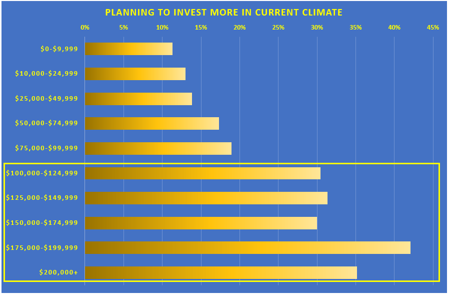 - Given the current economic climate, only 19% of Americans plan to invest more in the stock market. However, only 34% of households with an income of more than $100k plan to invest more in stocks.