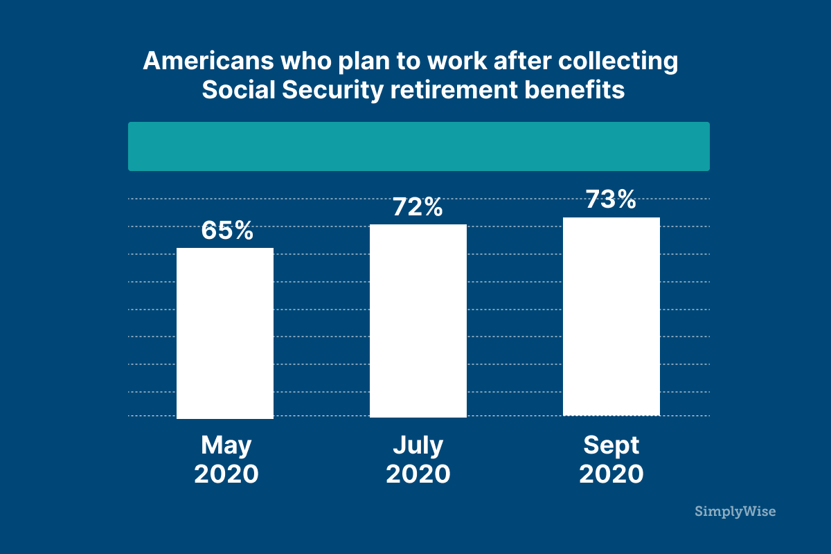 “The September Index found that more Americans than ever are planning to work into retirement. Today, 73% of workers plan to work after they claim Social Security retirement benefits. That is up from 67% this May and 72% in July. Delaying retirement may be attributed to the fact that only 63% of workers surveyed are making what they made prior to COVID-19.” – SimplyWise